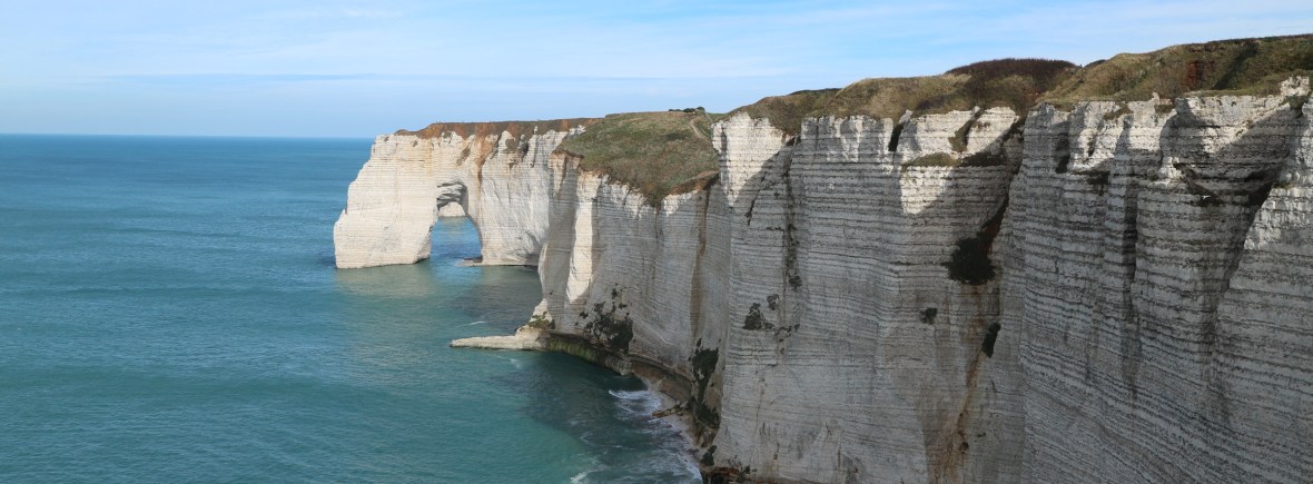 Ezután következett a kihagyhatatlan Étretat, ami a franciák „Grand Sites of France” listáján is szerepel. (Erről a listáról később több helyet is találtunk, amit érdemes meglátogatni, de félő, hogy mire a körúton újra visszaérünk az országba, már hófödte lesz egy részük.) Annak ellenére, hogy itt is ki vannak tiltva a lakóautók a pár utcás településről, könnyedén találtunk 10 perc sétányira helyet egy turistáknak kialakított parkolóban, ezért most nem kellett végigzongoráznunk a „lakóautó vagyunk-e, vagy csak egy ártatlan haszongépjármű” elmélkedést egy jó hely érdekében. A rövid séta után leesett az állunk, amikor kiértünk a városka tengerpartjára, mert mindkét irányban hatalmas fehér sziklafalak övezték az öblöt. Ha tudtuk volna, hogy ez még csak a kezdet, akkor talán el sem indulunk a felfelé vezető lépcsőkön, mert szokásunkhoz híven a tervezett rövid sétálgatásból órákon át tartó látvány-orgia kerekedett a szirteken…de jó is, hogy ebédeltünk előtte a kocsiban!