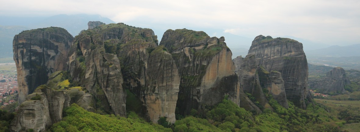 A Meteorák. Ez volt görögországi ittlétünknek a csúcsa. A meteora egyébként lefordítva „levegőben lebegőt” jelent. Szép, nem? Már messziről könnyű észrevenni – még esőben is, mint nekünk- ezeket a 100-150 méter magas gigantikus oszlopokat. A Világörökség címet méltán nyerhették el. Senki sem érti, hogy kerültek ide ezek a hol torony, hol csipke szerű kődarabok a semmiből, hiszen közel s távol nincs ehhez hasonló képződmény. Késő délután érkeztünk, esővel. Mikor kicsit alábbhagyott, sétálgattunk a kőrengetegben, kifejezettel jót tett a látványnak a szürke, szomorú idő.